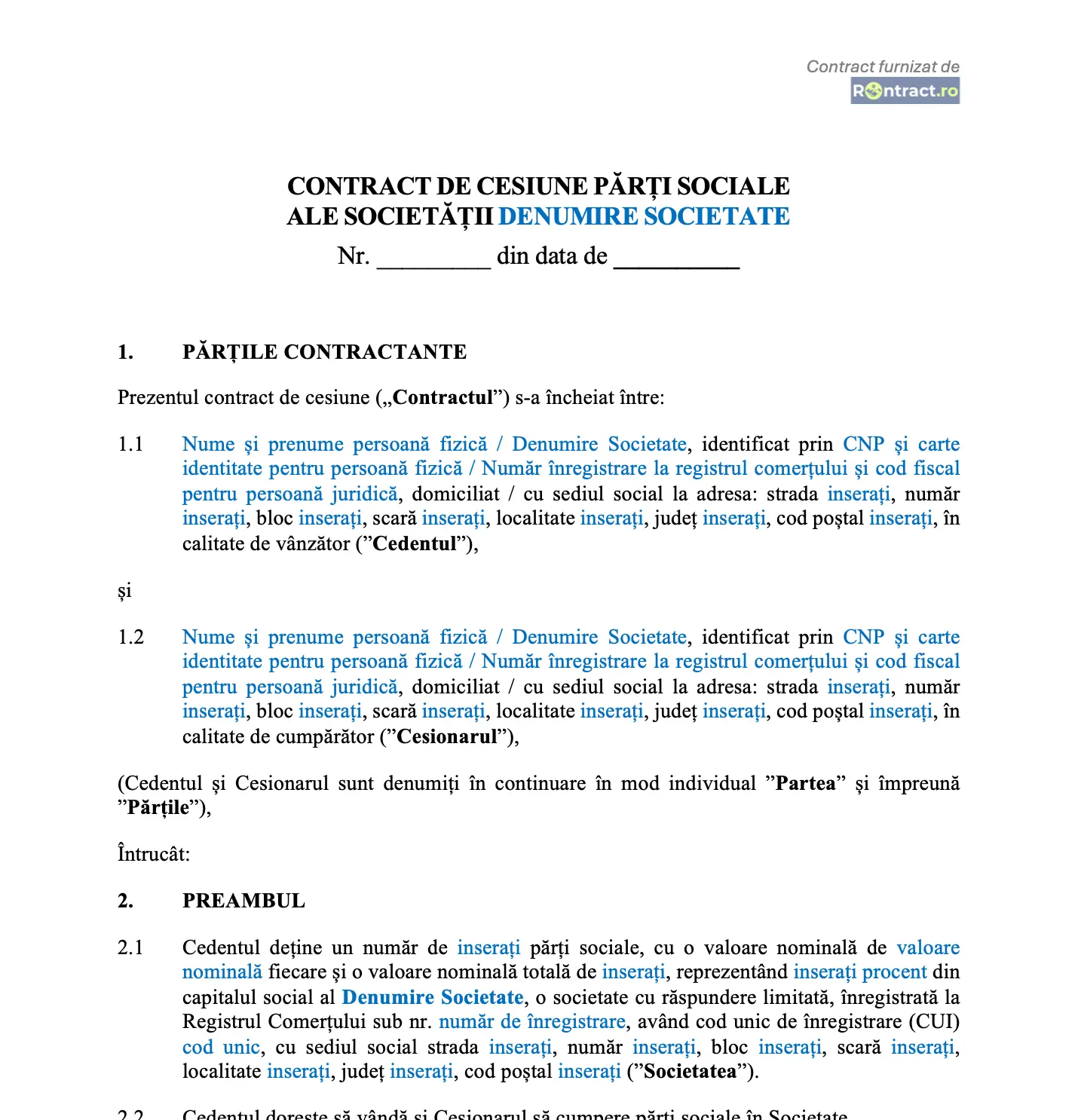 Contractul de cesiune părți sociale este documentul prin care un asociat își transferă părțile sociale către o altă persoană. Contractul intervine în timpul existenței firmei, ori de câte ori are loc o schimbare în structura asociaților. Poate duce la cooptarea unui terț în firmă.