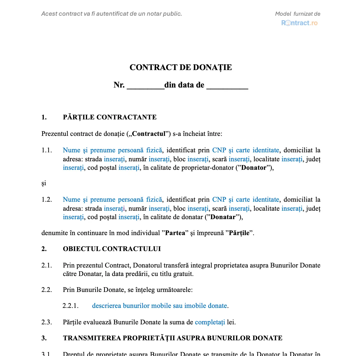 Acest model contract de donație conține clauza de revocare pentru ingratitudine și clauza de inalienabilitate (opțională). Sunt redactate în conformitate cu prevederile Codului Civil și cu jurisprudența instanțelor române.