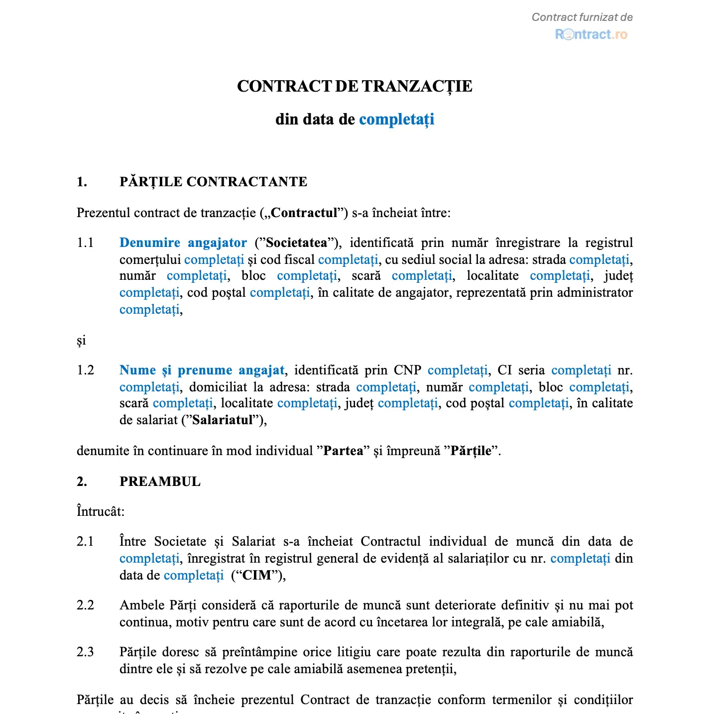 Modelul de contract de tranzacție pentru încetare contract de muncă este suficient de flexibil pentru a acoperi diverse situații întâlnite în relațiile de muncă.