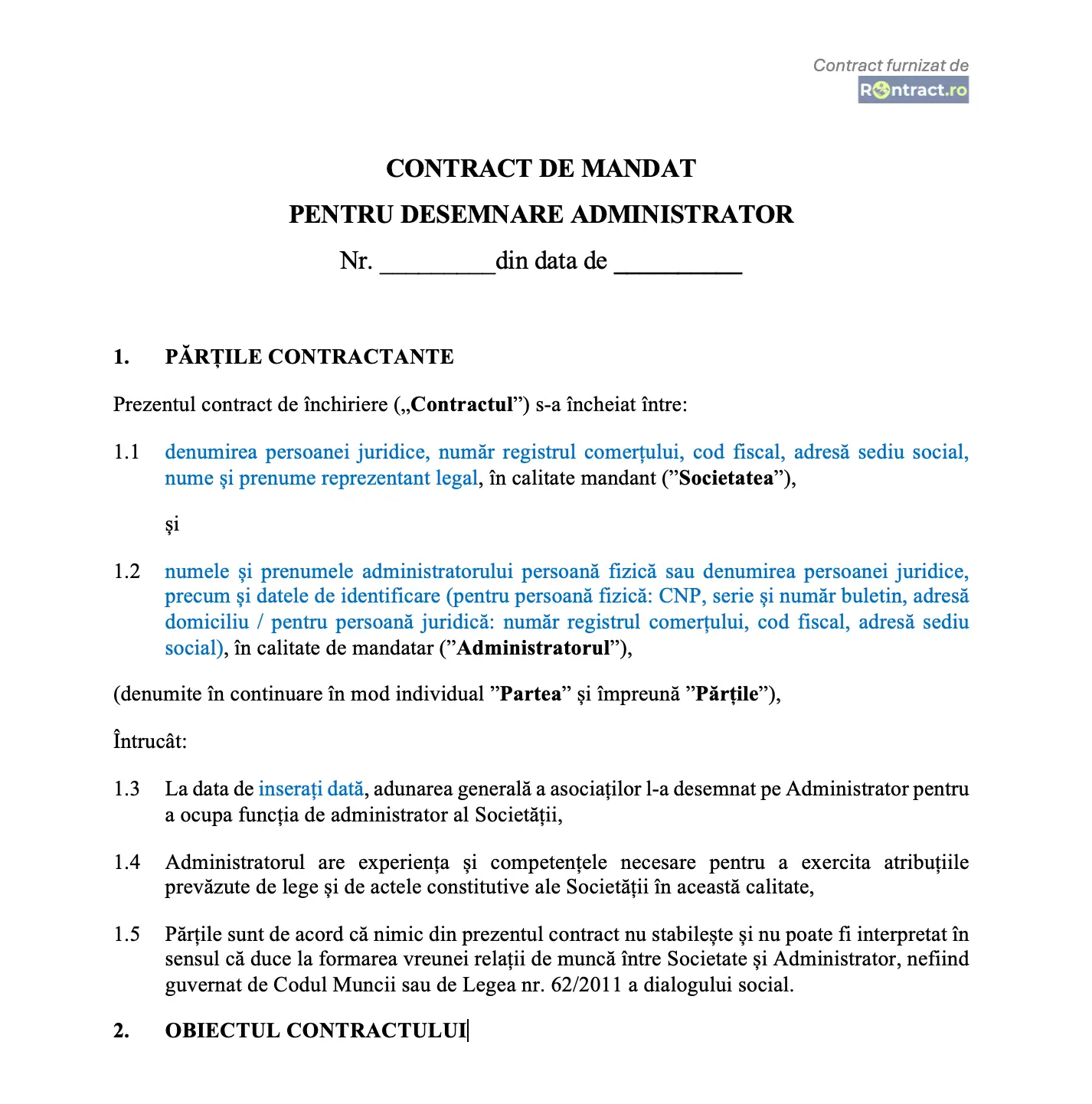 Contractul de numire administrator este documentul juridic prin care se oficializează mandatul administratorului. Stabilește durata, drepturile, obligațiile și responsabilitățile în detaliu și concret. Permite precizarea unor clauze specifice legate de remunerație, răspundere și condițiile de încetare a mandatului.