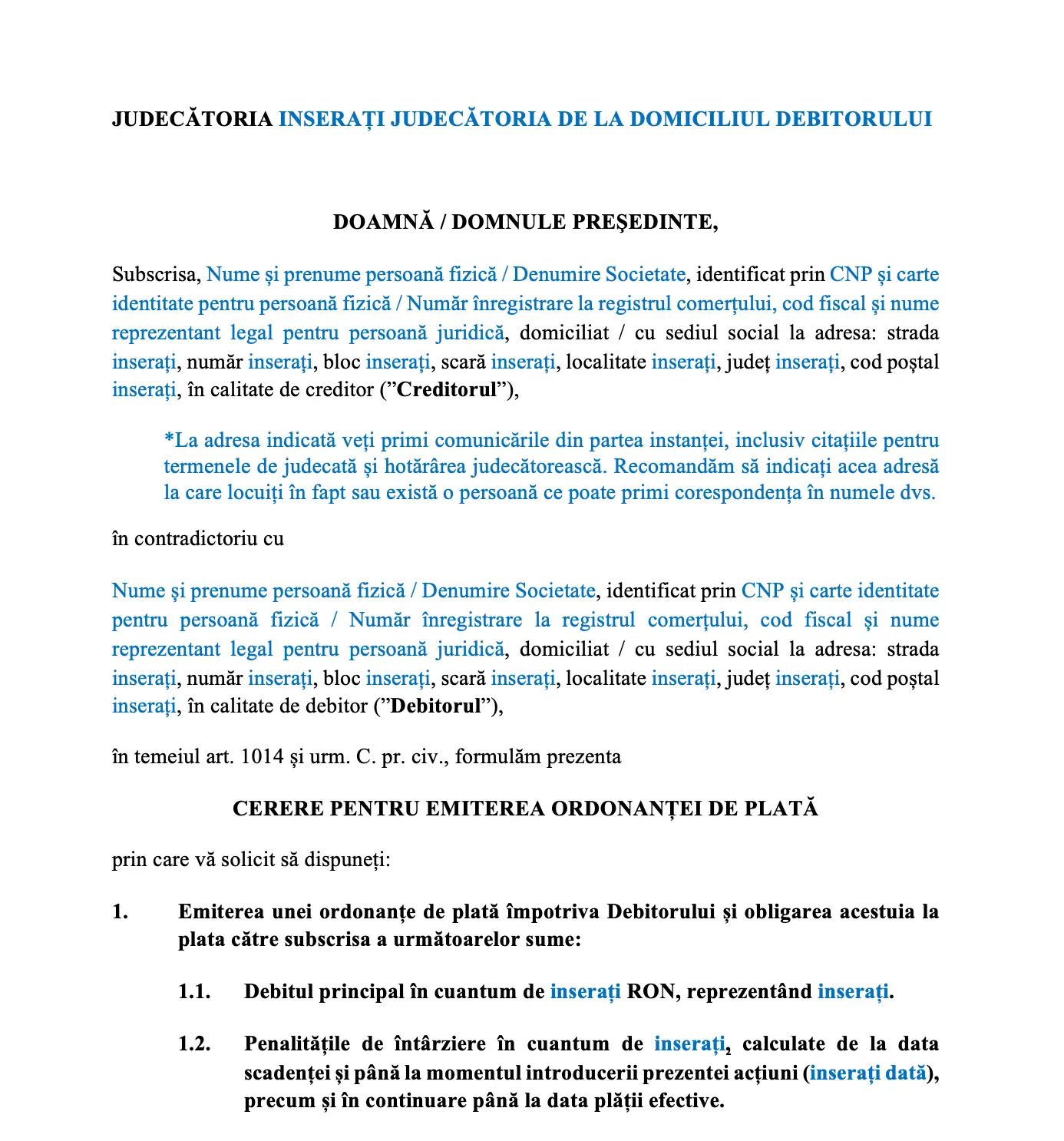 Modelul de cerere pentru ordonanța de plată este conceput să acopere o gamă largă de creanțe bănești. Oferă flexibilitate maximă în personalizarea conținutului în funcție de natura și specificul datoriei.